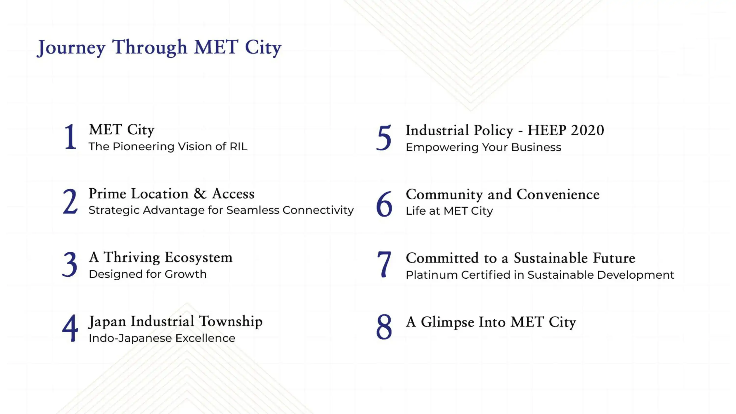 Disclaimer:- Welcome to MET City (“Website”). The contents of this website are for general informational purposes only. By using or accessing this Website and/or the hyperlinks embedded/ mentioned in the Website you agree to abide by the terms and conditions, as set forth herein and as contained in the Website without any qualification or limitation. In the event you do not accept/ agree to the terms of this Disclaimer, you are requested not to use the Website or download materials from the Website. Every endeavor has been made to keep the information updated. However, we make no representations or warranties of any kind, express or implied, about the completeness, accuracy, reliability, suitability or availability with respect to the Website or the information, products, services, or related graphics contained in the Website for any purpose. The Website and all its content are provided on an “as is” and “as available” basis and is intended for informational purposes only. No information given under this Website shall be treated as a warranty or representation by us. Your use of the Website is solely at your own risk. This Website is for guidance only. It does not constitute part of an offer or contract. The contents, including design and specifications are subject to change without prior notice. Computer generated images are the artist’s impression and are an indicative of the actual designs. By using and/or accessing this Website, you, the viewer/user acknowledge that the information including any material/ documents (such as brochures and marketing collaterals) on this Website are solely for informational purposes and you have not relied on this information for making any booking/ purchase/ intention to purchase/ invest in any project(s) of M3M INNOVATION PARK and/or its affiliates. Nothing herein shall be construed as any invitation, or offer for investment or deposit within the terms of the applicable law (as amended from time to time) including without limitation SEBI Act, 1992, Companies Act 2013 etc. and we shall not be liable for any consequence of any action taken by the viewer relying on such material/ information on this Website. The particulars contained on the Website mention details of Projects/ developments undertaken by M3M INNOVATION PARK and/or its affiliates. The contents are being modified in terms of the stipulations/ recommendations under the Real Estate Regulation Act, 2016 and Rules made thereunder (“RERA”) and accordingly may not be fully in line thereof as of date. Use of information shall be governed by Indian laws, RERA; subject to jurisdiction of Competent Authority under RERA, courts at Gurugram/ Haryana India. You are further advised to verify all the details, including area, amenities, services, terms of sales and payments and other relevant terms independently with the sales team independently, subject to prior appointment during working hours and speak to one of our sales staff, prior to concluding any decision for buying any unit(s) in the said project. In no event shall M3M INNOVATION PARK, its affiliates, employees, directors and/or officers be made liable for any claim as a result of any inaccuracies in the information provided in this Website, though all efforts have to be made to ensure accuracy and under no circumstances shall we be liable for any expense, loss or damage including, without limitation, indirect or consequential loss or damage, or any expense, whatsoever arising from use, or loss of use, of data, arising out of or in connection with the use of this Website.